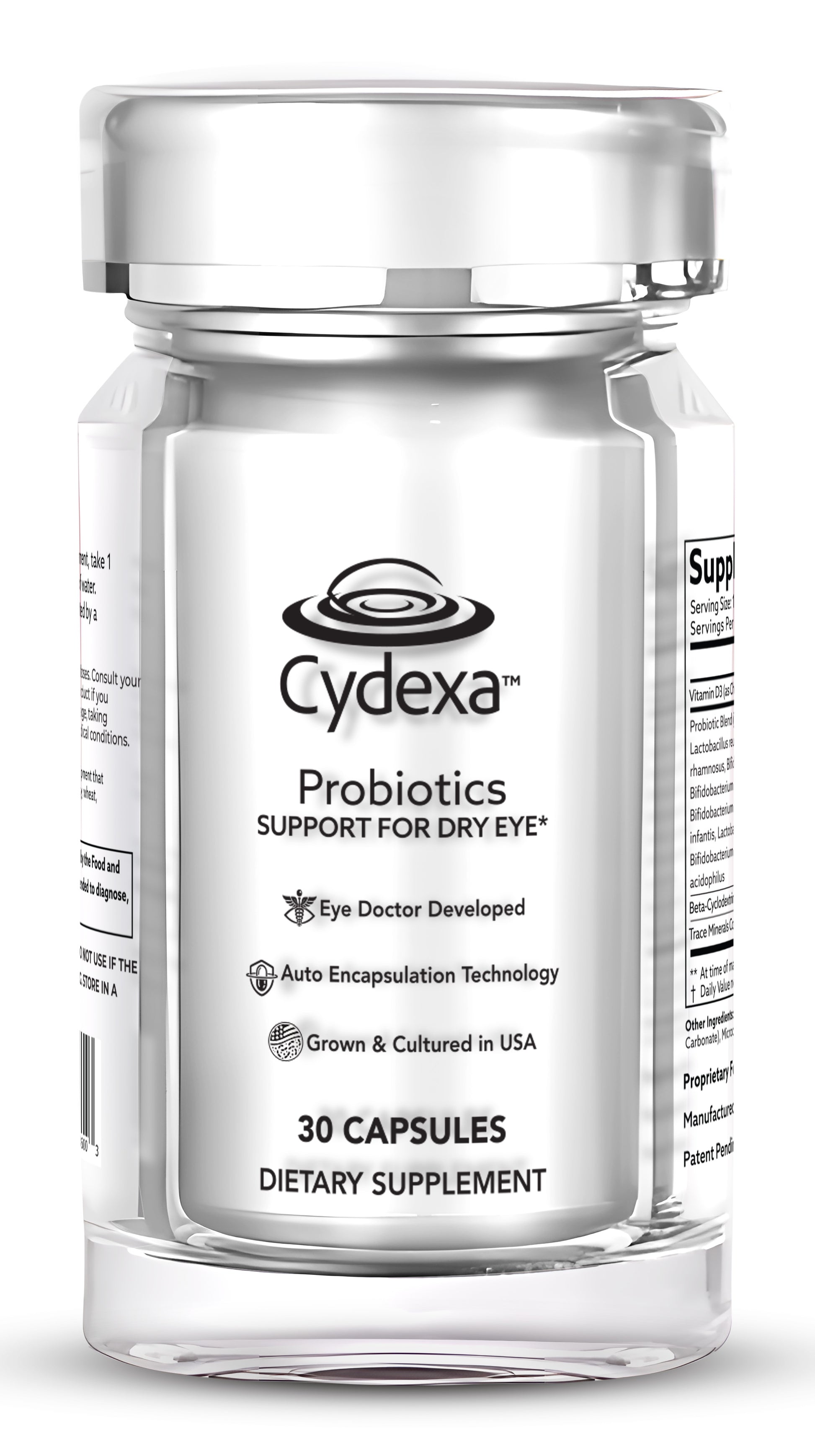 Our Patent Pending probiotic blend consists of USA grown strains using only the highest grade of probiotics developed, cultured, and purified in America. Cydexa™ is the perfect blend of probiotics to help restore the homeostatic balance of our eyes.